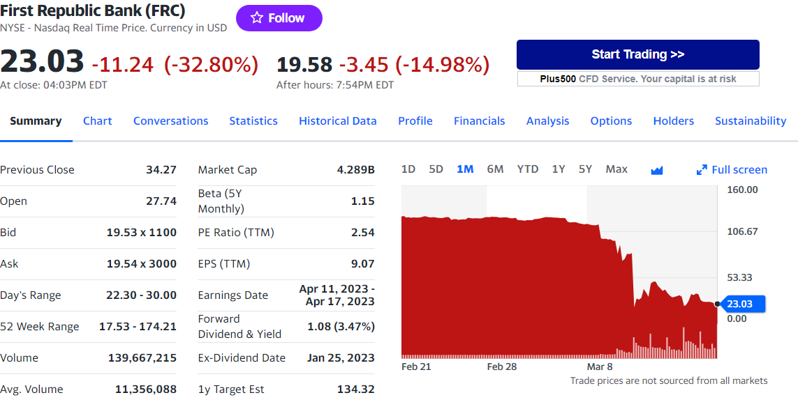 이에 FRC 주가는 30%폭락하다가 9% 상승을로 마감.