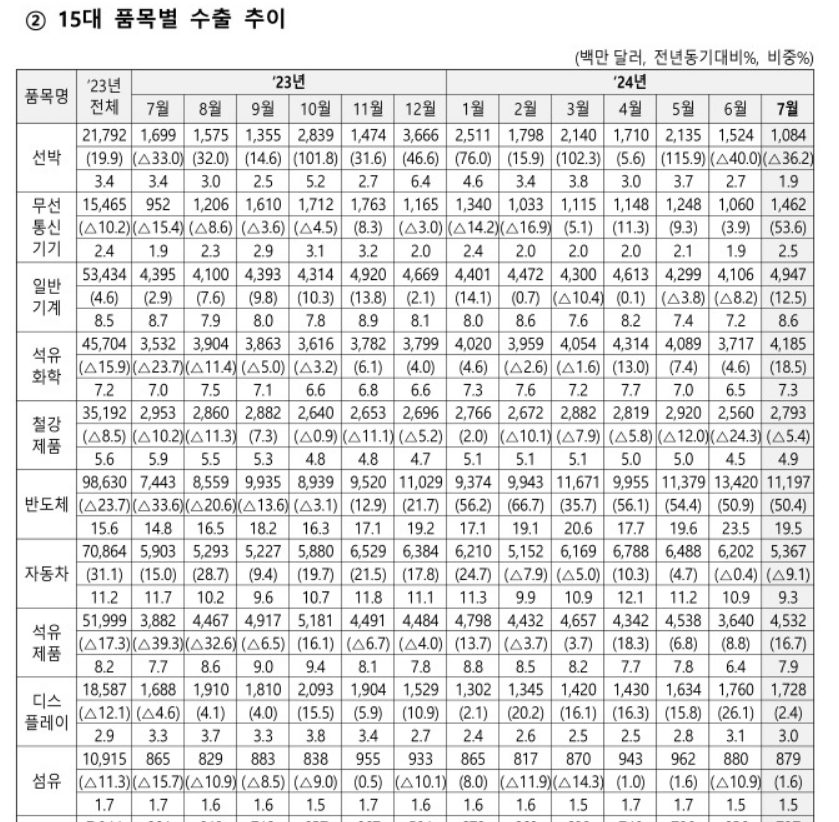 7월 반도체 수출 112억달러로 전년 동월 74.43억달러대비 50.4% 증가.