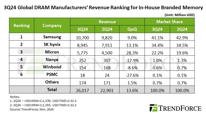 TrendForce’s latest investigations reveal that the global DRAM industry revenue reached US$26.02 billion in 3Q24, marking a 13.6% QoQ increase.