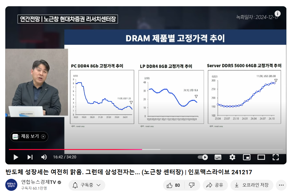 16분경:2024년 PC와 모바일 디램 DDR4 고정가격은 하락했으나 서버 디램 DDR5 5600 64GB 가격은 안 빠짐.