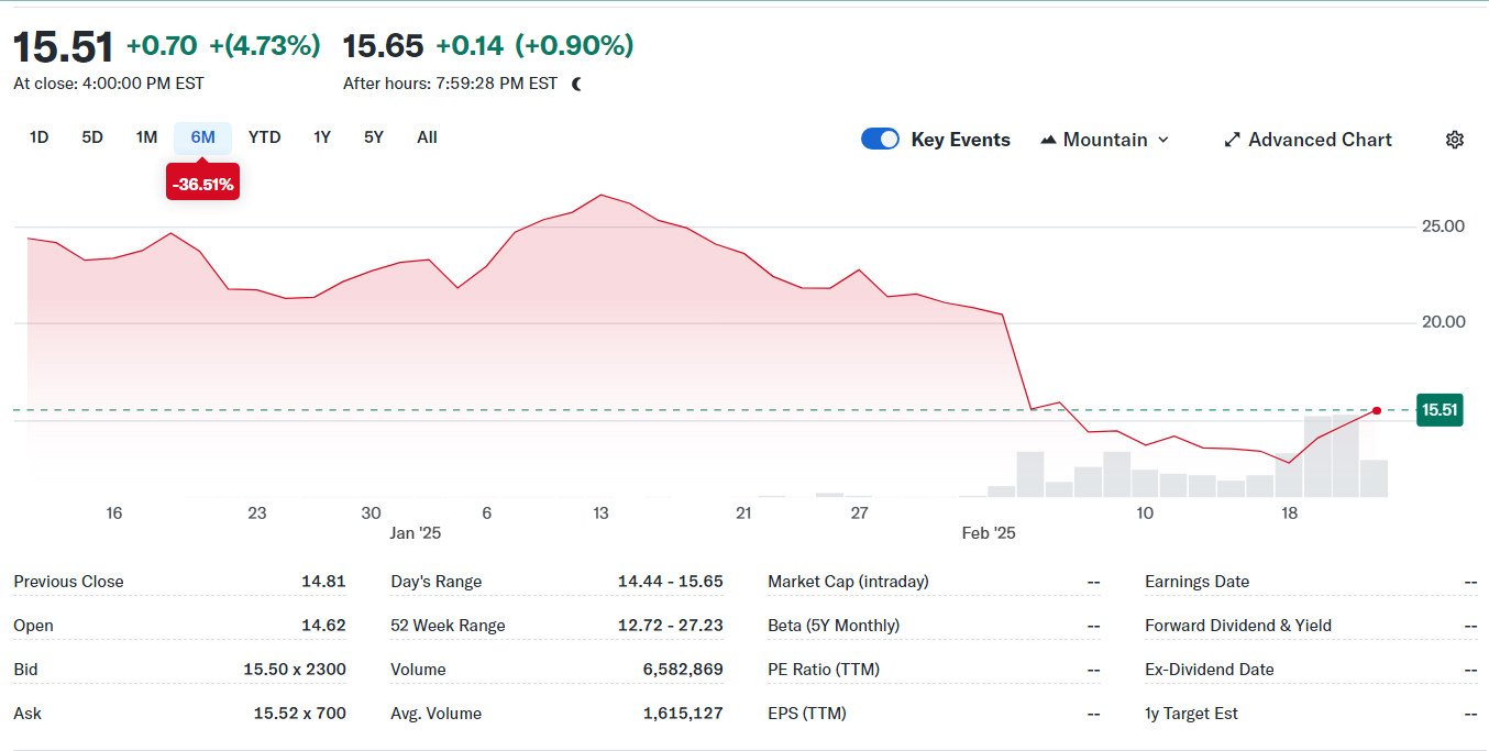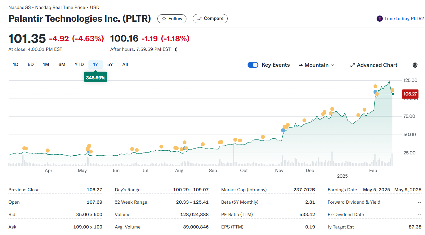 미국 시간 2월21일, 그 동안 4배 정도 상승하던 AI 소프트웨어 업체 팔란티어는 4.63% 하락했다.