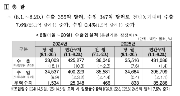 관세청-2025년 8월 1일 ~ 8월 20일 수출입 현황