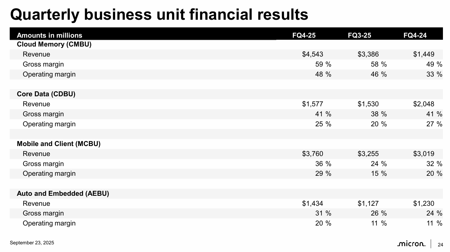 - 2024년 3월 실적 발표 때, 우리는 마이크론이 반도체 산업에서 AI의 가장 큰 수혜자 중 하나가 될 것이며, 2025 회계연도에는 사상 최대 매출과 크게 개선된 수익성을 달성할 것이라고 전망했습니다.