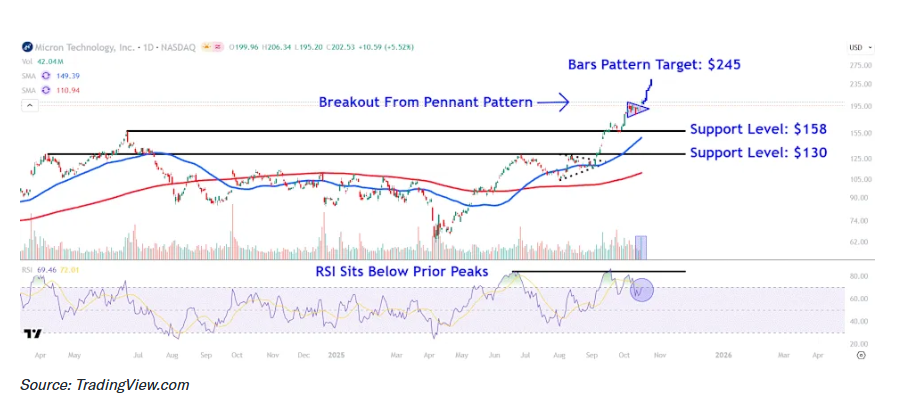 이달 초 처음으로 200달러를 돌파한 이후, 마이크론 주가는 페넌트(삼각 깃발형) 패턴 내에서 조정을 거쳤습니다.