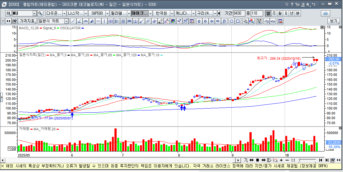 이 분석에 따르면, 상승세가 이어질 경우 마이크론 주가는 빠르게 약 245달러 수준까지 상승할 가능성이 있습니다.