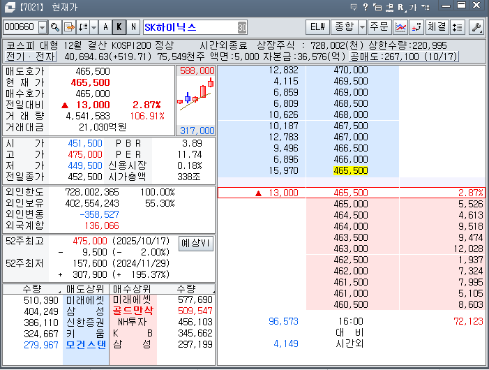 참고로 SK하이닉스 종가는 465,500원이고 시총은 338조원이다.