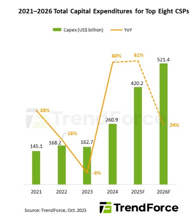 TrendForce는 GB·VR 시스템과 같은 랙스케일 솔루션이 2026년에 본격적으로 성장함에 따라, 이들 8개 CSP의 총 CapEx가 5,200억 달러를 돌파하며 전년 대비 24% 증가해 새로운 정점을 찍을 것으로 전망했습니다.