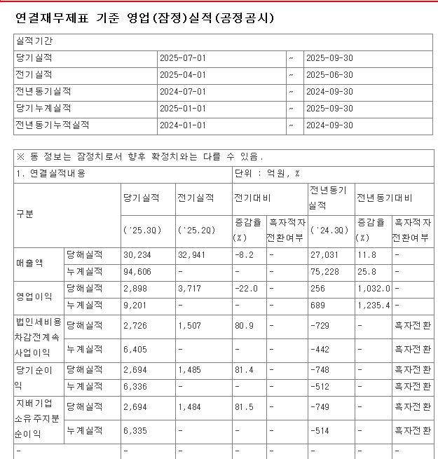 한화오션은 2025년3분기 매출 3조234억원, 영업이익 2,898억원, 순이익 2,694억원을 달성했다.