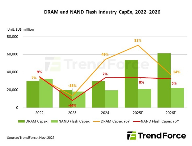 2026년 DRAM과 NAND에 대한 설비투자(CapEx)는 비교적 제한적으로 증가하는 데 그칠 전망이다.