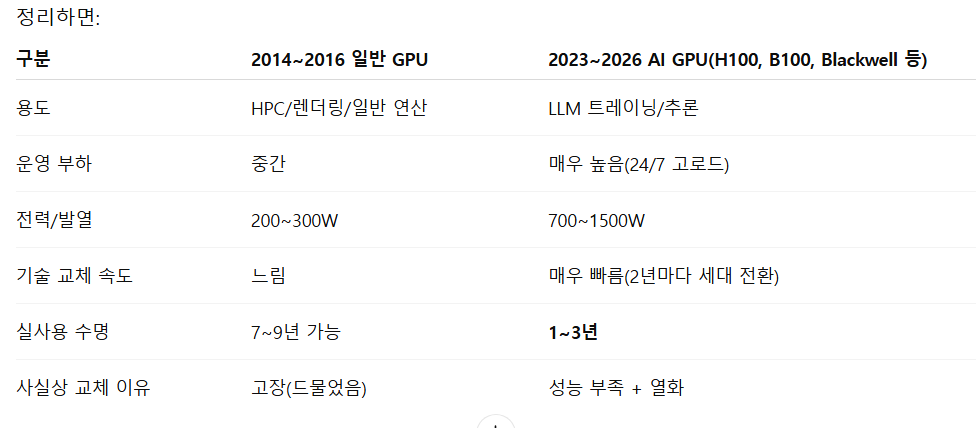 - 만약 사용자가 데이타센터 수준의 AI 트레이닝/추론용 GPU를 고려 중이라면, “1~3년”이라는 매우 짧은 기대수명으로 예산·감가상각을 설계하는 것이 현실적입니다.
