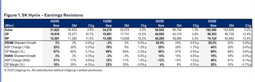요약: 씨티는 2026년 디램과 낸드 판매가격이 2025년대비 각각 40%,46% 상승할 것으로 예상.