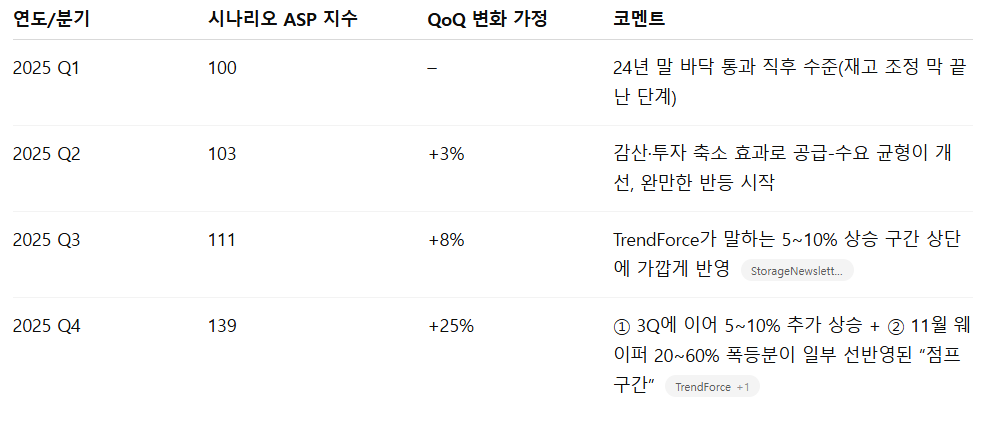 - 2026 연평균 ASP: 2025 Q1 대비 +70~80% (지수 170~180)