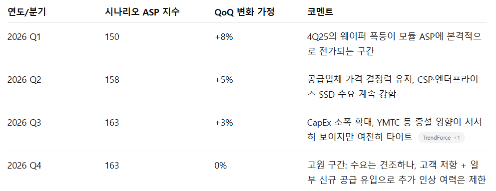 - 2026 연평균 ASP: 2025 Q1 대비 +40~45% (지수 140~145)