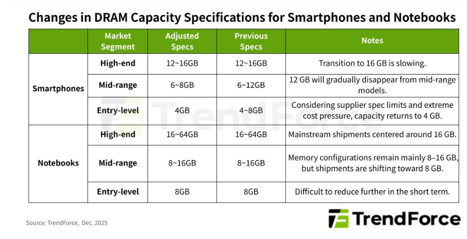 TrendForce: 2026년 1분기까지 메모리 가격 급등 지속… 스마트폰·노트북 업체, 가격 인상과 사양 하향 불가피
