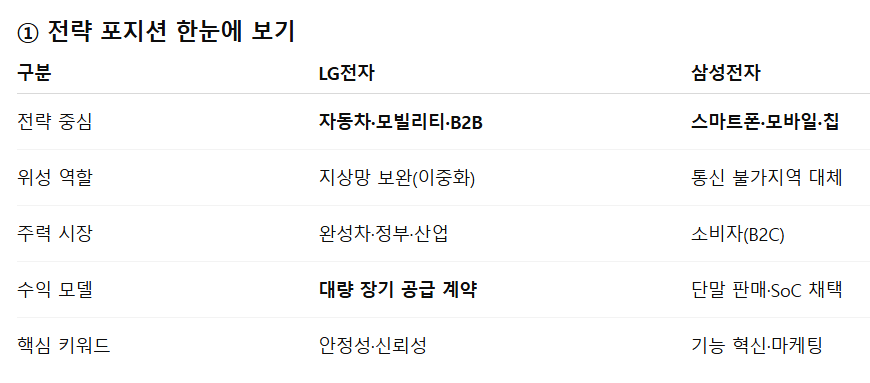 2️⃣ LG전자 vs 삼성전자 위성 전략 비교