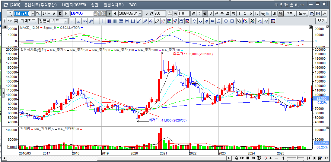 다음은 LG전자의 주봉 월봉 연봉그래프