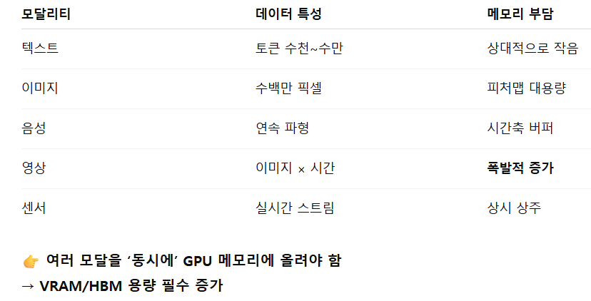 - 멀티모달은 동시 데이터 + 다중 인코더 + Fusion으로 메모리 상주량을 폭증시킨다