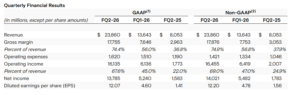 - 매출액 239억 달러 (q-q +75%, y-y +196%), 영업이익 165억 달러 (OPM 69%, q q +22%p, y-y +44%p), Diluted EPS $12.20