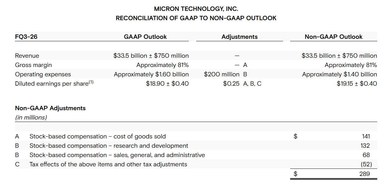 상기 표는 현재 전망을 기반으로 GAAP 기준과 비GAAP 기준 가이던스를 조정(reconcile)하여 보여준다.