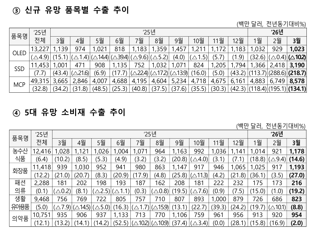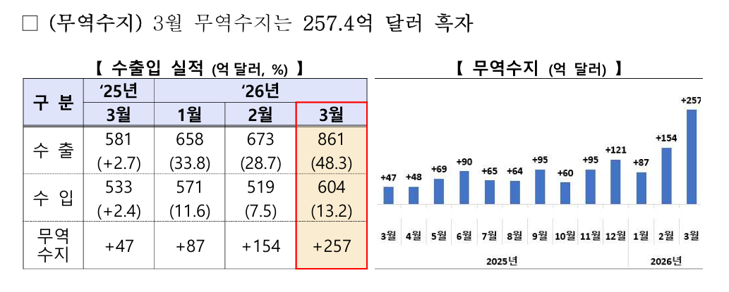 【수출】3월 수출은 중동 전쟁에도 불구하고 48.3% 증가한 861억 달러를 기록하며 사상 처음으로 800억 달러를 상회했으며,