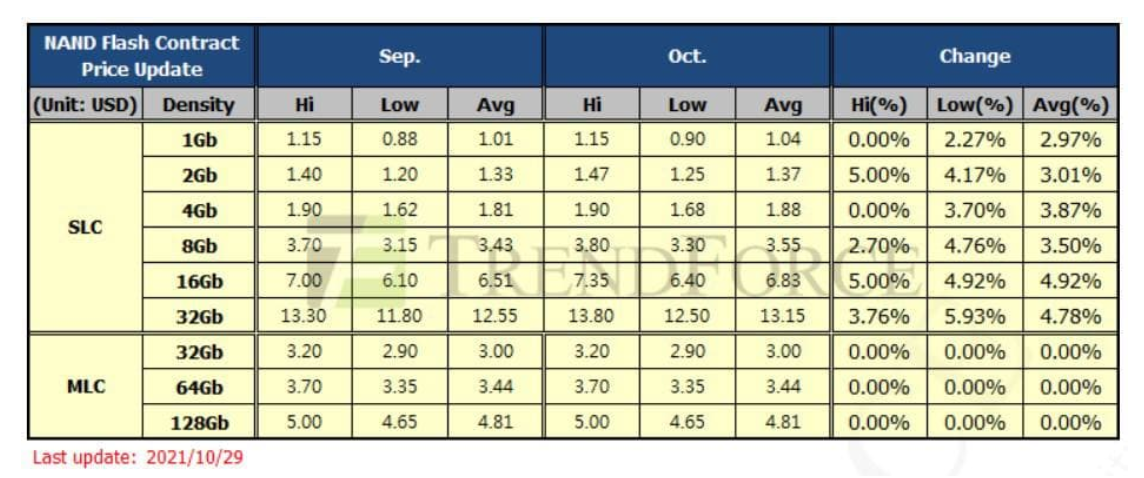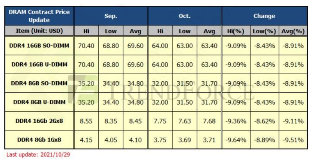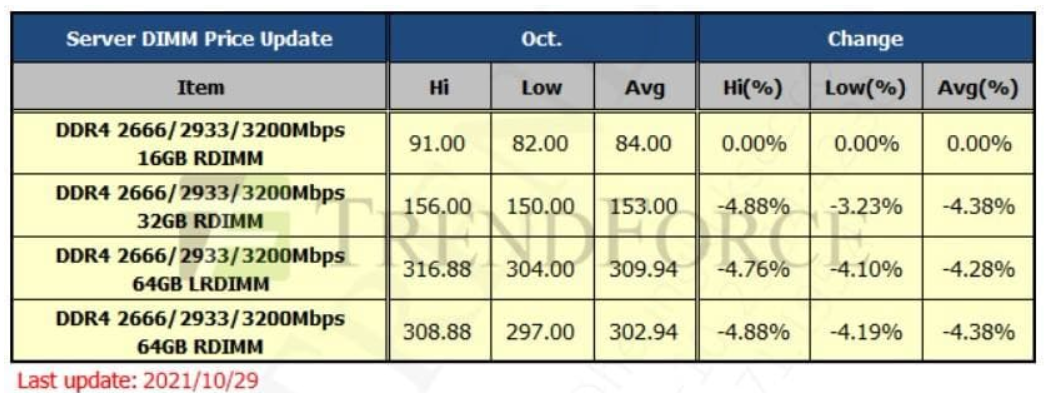 21년 10월 서버 DRAM 가격 전월대비 4% 하락, PC DRAM 가격 전월대비 9% 하락.