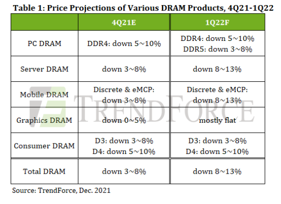 분석:시장조사 기관 트렌드포스는 2022년1분기 디램 계약 가격은 전분기대비 8%-13% 하락하고,