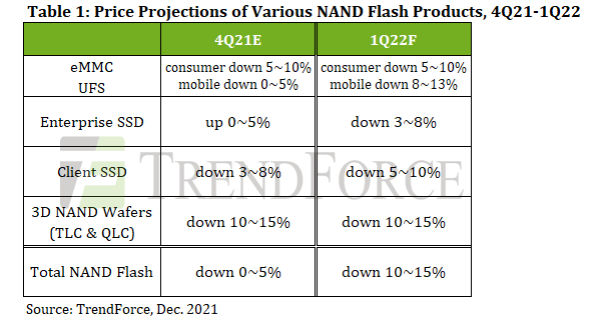 앞으로의 NAND Flash 계약 가격 추세의 관점에서, 생산은 영향을 받지 않기 때문에 TrendForce는 1Q22의 평균 가격이 10-15% 하락할 것으로 예상하면서 여전히 원래 의견을 유지합니다.
