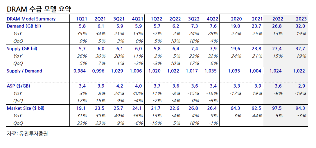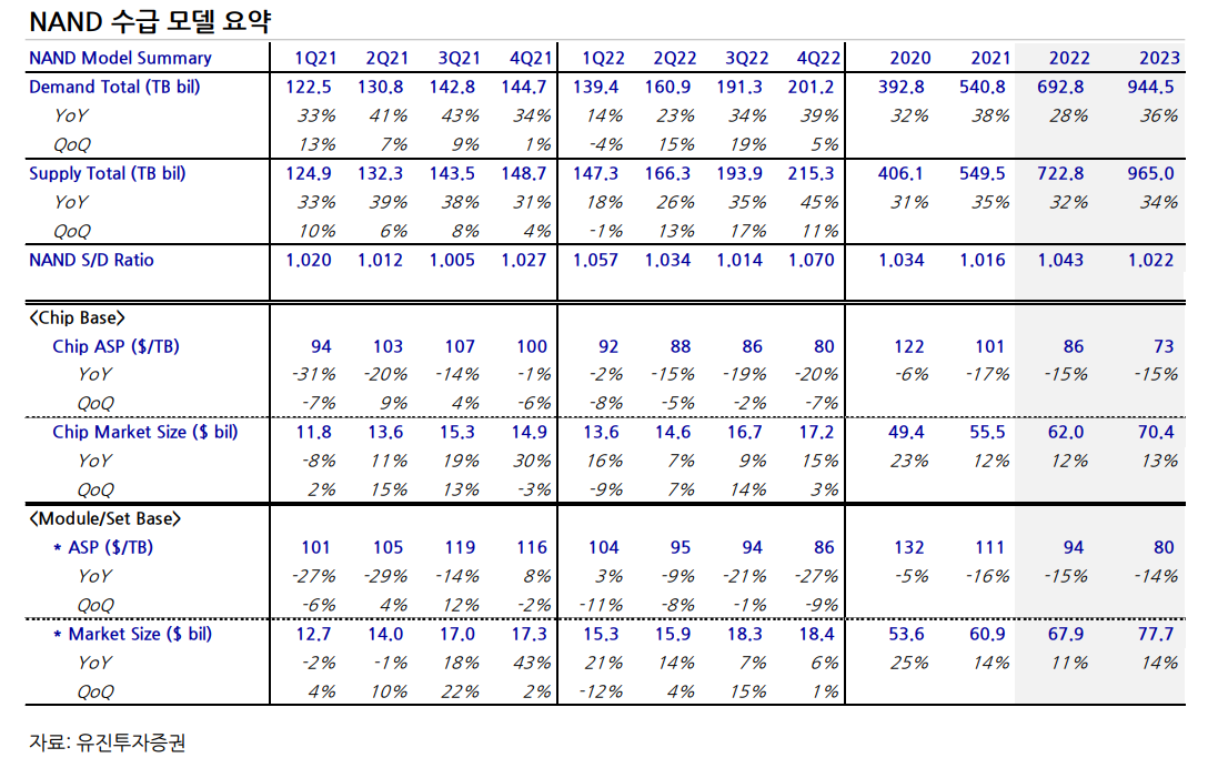 2022년 NAND 총 수요는 28% 증가한 6.928억GB, 총 공급은 32% 증가한 7,228억GB로 추정.