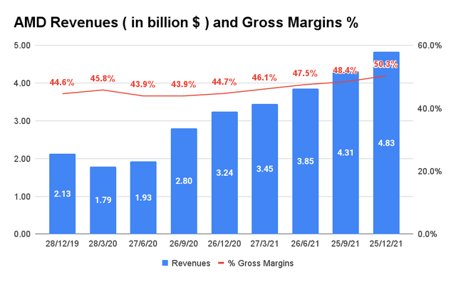 For FQ1'22, AMD guided revenues of approximately $5B and gross margins of 50.5%, representing a remarkable increase of 3.5% QoQ and 44.9% YoY. For FY2022, consensus estimates that the company will report revenues of $25.37B, representing an impressive 54.4% YoY growth. However, AMD had guided slightly lower revenues of $21.5B at 31% YoY growth, with gross margins at 51%.