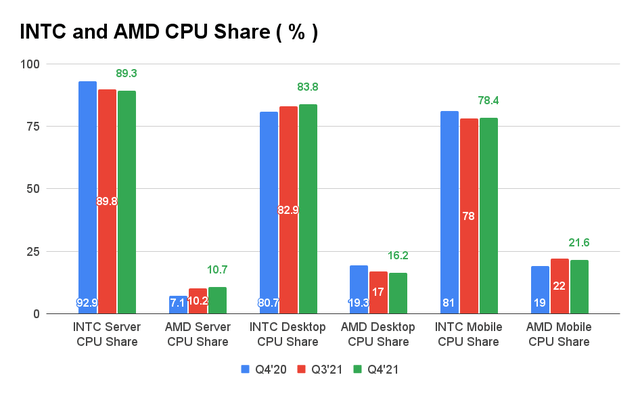 - AMD is gaining ground with a 10.7% market share in the global server CPU market as of Q4'21 while reporting blockbuster revenues of $4.1B for that particular segment in FY2021.
