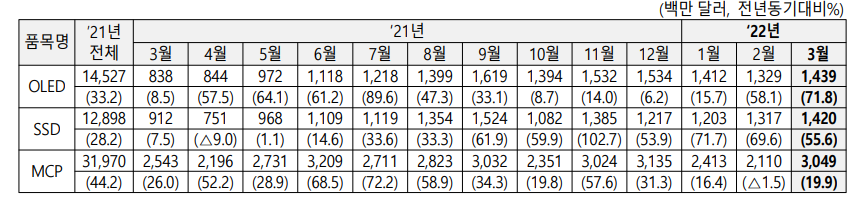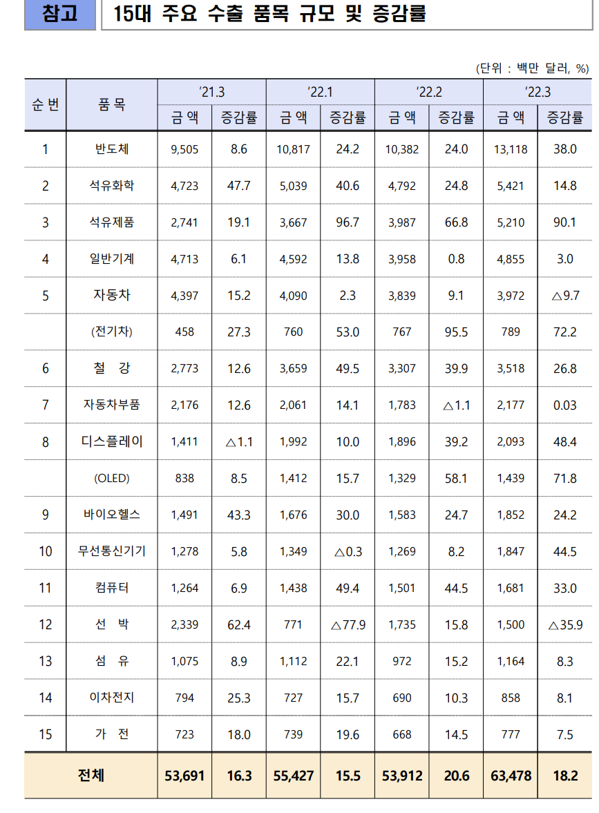 요약: 2022년3월 반도체 수출은 전년 동월대비 38% 증가한 131.18억달러였고,