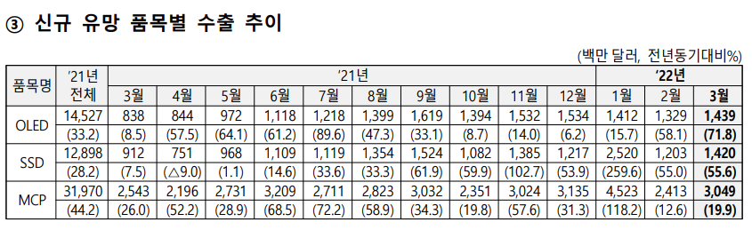 2022년 1분기 반도체,SSD와 MCP 합산 수출액은 2021년4분기 합산 수출액보다 0.11% 증가했다.