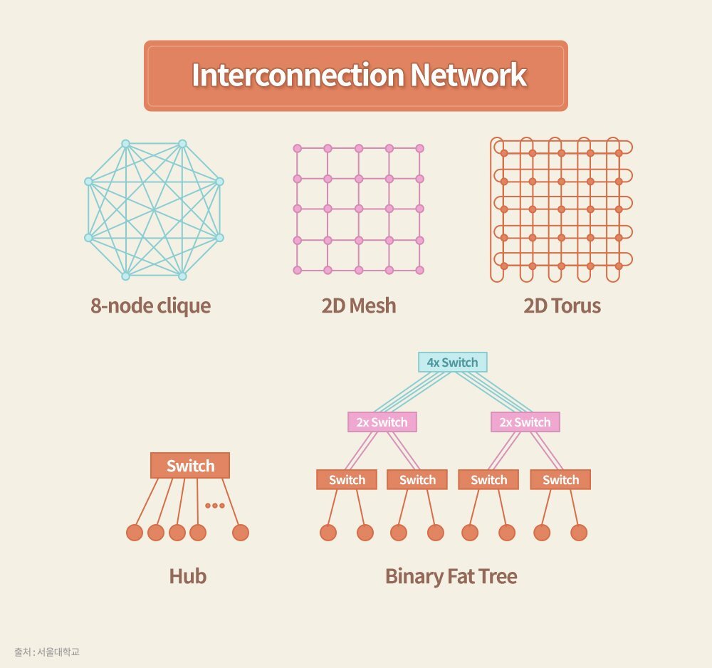 이러한 성능의 확장성(Scalability)을 효율적으로 제공하기 위해서는 각 프로세서 사이의 연결 구조가 중요하다.