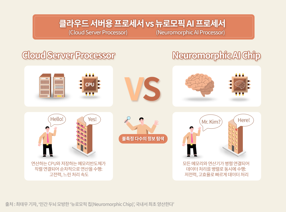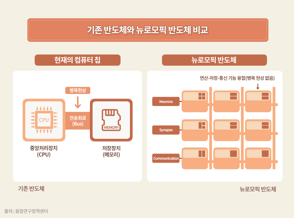 1) 뉴로모픽(Neuromorphic) 반도체: 사람 뇌의 신경구조를 모방한 반도체 소자로서, 뉴로는 신경, 모픽은 형상을 의미한다. 병렬로 작용하는 인간의 뇌를 모방해 병렬 형태의 연산구조를 지니고 있다.