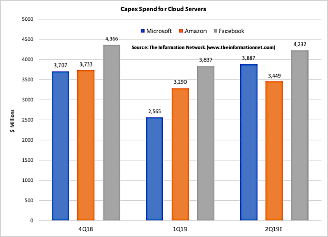In January 2019, I estimate that DRAM inventory at server companies exceeded 10 weeks, versus a normal level of 4 weeks. In June 2019, according to our report entitled "Hot ICs: A Market Analysis of Artificial Intelligence (AI), 5G, CMOS Image Sensors, and Memory Chips," most of the server companies are close to the normal historical level of 4 weeks. Alibaba (NYSE:BABA) still has 6 weeks of inventory, while Baidu (NASDAQ:BIDU), Tencent (OTCPK:TCEHY), Amazon (AMZN), and Microsoft (MSFT) are down to 5.5 weeks. Facebook (NASDAQ:FB) has an estimated 5 weeks of supply while Google (NASDAQ:GOOG) (NASDAQ:GOOGL) is at 4 weeks.