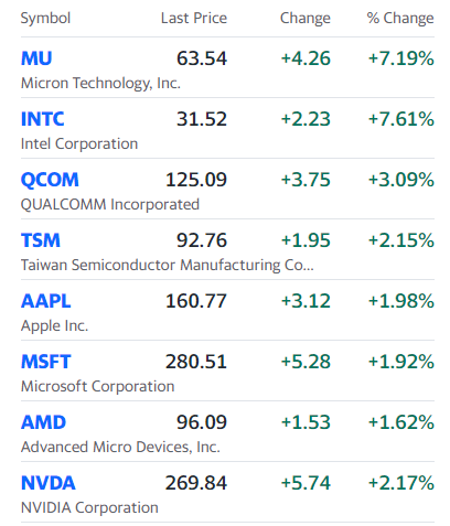 사실상 모든 반도체 주식은 화요일 장 마감 후 발표된 마이크론의 회계 2분기 보고서 에 의해 상승했습니다.