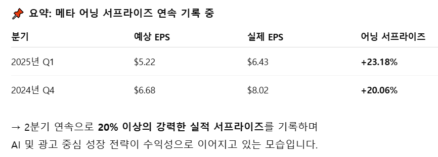 요약: 메타는 AI 투자 + 광고 수익 호조 덕분에 수익성과 성장성 모두 기대치를 초과하는 어닝 서프라이즈를 기록했습니다.