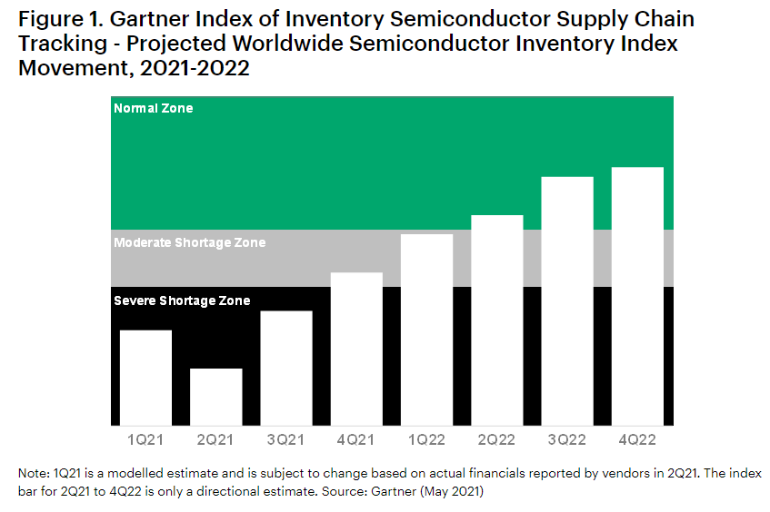 According to the Gartner Index of Inventory Semiconductor Supply Chain Tracking, the semiconductor market will remain “severely undersupplied” this year before higher foundry output starts to ease the supply shortage in either the fourth quarter 2021 or the first quarter 2022.