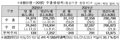 6월 1~20일 수출 29.5% 증가…일평균 33.7%↑(종합) | 연합뉴스 (yna.co.kr)